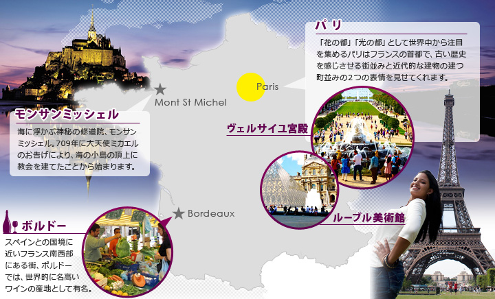 ヨーロッパでも有数の巨大な国際都市であるパリは、世界で最も美しい都市と言われ、文化・芸術・ファッション・食べ物・デザインなど様々な分野で長い歴史を持ち、海外からの観光客が多く訪れます。